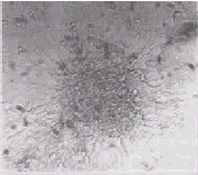 顶层琼脂制备:0.7%琼脂与等体积2×1640混匀,以3ml分装试管中,再向管中加入0.2ml计数约1000个细胞的悬液,充分混匀后,注入上述底层平皿中。待上层琼脂凝固后,置入37℃、5%CO2培养箱中,培养10~14天,在倒置显微镜下观察细胞集落生成情况,并计数。