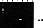 1:100 bp PCR Ladder 2:无模板之阴性对照 3:无Taq酶之阴性对照 4~6:阳性PCR产物 7: 正常对照