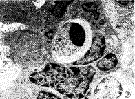 图1 置FCu-IUD或TCu220C妇女子宫内膜,显示微血管内皮细胞肿胀,血管腔内血细胞凝集。EM ×8000
