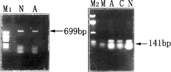15例人胃癌细胞总RNA分别与上述八种Cx探针Northern杂交,结果均未见杂交信号。将15例人胃癌细胞mRNA逆转录成cDNA后,分别用Cx26、Cx32、Cx40、Cx43基因PCR引物进行PCR扩增,结果5例低分化腺癌、1例印戒细胞癌、1例高分化腺癌扩增出了一条141bp的弱带(图2),表明Cx43在人胃癌细胞中表达水平低。