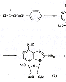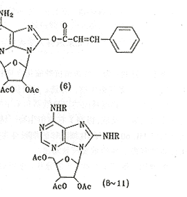 8-氯腺苷和维甲酸在细胞的生长和调节中起着非常重要的作用,维甲酸可治疗白血病,8-氯腺苷对人和多种哺乳动物的恶性肿瘤有抑制生长作用[1,2]。8-氯腺苷的8位和维甲酸的共轭体系及极性部分对生物活性影响极大[3],为寻找新型抗肿瘤化合物,我们在腺苷的8位引入芳香酰胺基,酰氧基或含有共轭双键的芳香酰基和酰胺基,模拟维甲酸的共轭部分,利用各自的结构特点将两类化合物结合在一个化合物中,获得了一类新型化合物。