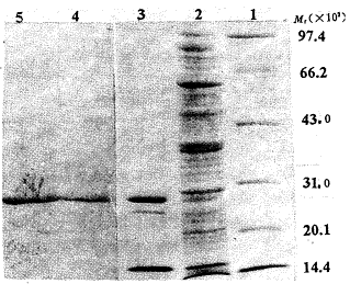 1:Protein relative molecular mass(Mr); 2:ScFv before purification (mixture of periplasmic extract and culture medium concentrated by (NH)2SO4 precipitation); 3:ScFv purified by HiTrap Anti-E Tag affinity column; 4:Anti-E Tag binding characteristic of ScFv 23 loaded on lane 2; 5:Anti-E Tag binding characteristic of ScFv 23 loaded on lane 3