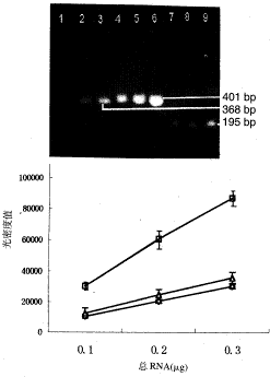 上图 电泳照片 1,4,7:总RNA量0.1 μg; 2,5,8:0.2 μg; 3,6,9:0.3 μg; 1~3:t-PA; 4~6:PAI-1; 7~9:GAPDH.