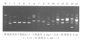 图3引物OPD-05扩增的黑曲霉、土曲霉和构巢曲霉RAPD带型