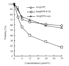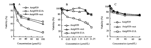 顺铂、泰素和VP16对Anip973,Anip973-vect和Anip973-E1A细胞杀伤作用的剂量效应曲线(图1A,B,C)显示,Anip973-E1A细胞对顺铂和泰素的敏感性明显高于Anip973和Anip973-vect细胞。顺铂的IC50值约减少了7倍。但是,E1A基因对VP16未显示增敏效应。