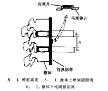 因韧带的伸缩变形范围较大,故在每具标本L1椎体前缘前纵韧带正中区用丝线固定一个桥式弓形应变传感器,传感器用优质磷青铜片制作,铜片正面粘贴高灵敏应变片(图3)。