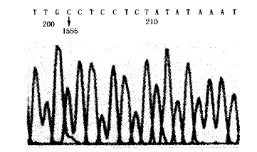对家系成员Ⅰ1、Ⅱ2、Ⅲ1、Ⅳ1 mtDNA 1555位点的测序结果表明,1555位点存在A→G点突变(H链,图3),而配偶和男性后代的1555位碱基为正常的A(L链)。