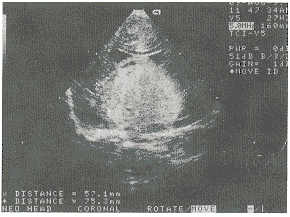 讨论:血管瘤是儿童常见病,女孩多于男孩。最常发生于皮肤;肝脏、肌肉、腮腺也可发生,颅内较少见。1.5岁幼儿,颅内血管瘤如此巨大更罕见。如果脸部三叉神经分布范围内有红斑痣应引起注意,有可能在同侧大脑半球也有类似血管瘤,以后可出现癫痫,称“Sturge-Weber综合征”。此病主要是毛细血管瘤病变发生在同侧脑部三叉神经分布区皮肤、粘膜、脑膜和脉络膜,大脑皮质受损,出现智力低下、癫痫或脑瘫。2岁以内婴幼儿经前囟窗扫查,图像清晰,是理想的检查方法。
