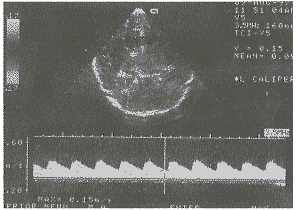中国超声医学杂志991030 患儿男,1.5岁,不能独自站立、不会走。查体:神志清,智力反应差。背部有一1cm×1cm淡红色斑痣,面部无皮损。四肢活动不灵活,肌张力增高,膝反射活跃。超声检查:(前囟窗)脑中线居中,双侧侧脑室对称,前角扩大、变钝,宽1.1cm,脑中线到前角处侧壁距离2.4cm。颅组织回声均质。双侧侧脑室下方见一5.7cm×7.5cm×5.2cm圆形强回声光团,中心回声稍低。其内有不规则“小等号”状血管断面回声。边缘清晰,有线状高回声。不伴声影和声晕,后方无衰减(见图1)。彩色多普勒超声显示:内部及周边少许点状及斑片状色彩暗淡的血流信号。脉冲多普勒在肿物周边探及低速动静脉血流信号(见图2)。双侧大脑中动脉、左侧大脑前及大脑后动脉血流速度明显增高,收缩期、舒张期均增高。频谱形态正常,PI、RI、S/D正常。右侧大脑后动脉正常。未探及右侧大脑前动脉。超声诊断:颅内血管瘤。MRI证实为颅内巨大血管瘤。