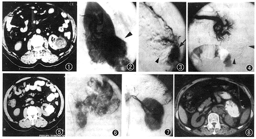 图1~5 为同一病人(例4),病理诊断为肾透明细胞癌。图1为CT平扫,示左肾下极占位病变;图2为血管造影,示左肾下极肿瘤染色灶(▲);图3为肾被膜动脉造影,示该血管向肿瘤供血(↓);图4为栓塞肾动脉分支及肾被膜动脉后血管造影,示肿瘤血供完全消失(▲),4周后重复血管造影显示同样结果;图5为3周后CT平扫示肿瘤缩小,碘化油在病灶内均匀聚集 图6~8 为同一病人(例8),影像诊断为左肾上腺癌。图6为肾上腺动脉造影,示左侧肾上腺区肿瘤染色灶;图7为栓塞该动脉后血管造影,示肿瘤血供消失,局部碘化油聚集;图8为3周后CT扫描,示肿瘤内碘化油聚集附表 9例肾癌、肾上腺癌病人资料及TAE后随访情况