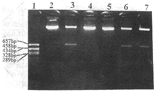 1:DNAmarkers,pGEM7zf(+)Hae Ⅲ;3,6,7:Positive clones;2,4,5:Negative clones