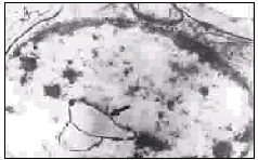 Fig 3 Ultratructure of neuron, 2 h after spinal injury Disappearence of nucleolus, chromatin aggregated peripherally, vacuole formation in the nucleous(), and expansion of reticular endothelium(▲) (TEM×11 500)