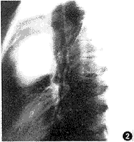 X线检查: 正位胸片示左侧胸腔一12.0cm×7.0cm长椭圆形块影,边缘光滑,密度均匀,基底部与纵隔左缘相连;侧位见块影居纵隔前上方,略呈分叶状,其上缘见条状钙化影(图1、2)。