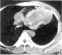 CT扫描: 左上纵隔明显宽,其内见一约10.5cm×7.5cm×8.4cm大小之密度增高块影,其内大部分呈液性密度,部分呈软组织密度,边缘处见斑片状钙化影。气管及主支气管尚通畅。纵隔内未见肿大之淋巴结(图3、4)。
