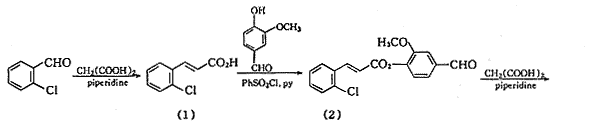 将0.0175mol邻氯肉桂酸加入50mL三颈瓶中,加入20mL干燥吡啶,搅拌使固体溶解.在冰浴冷却下,缓慢滴加0.0176mol新蒸苯磺酰氯.室温下反应15min,用冰水浴冷却,再滴加0.0178mol香草醛和9mL吡啶的混合液,搅拌反应3h.倾入30g碎冰中,抽滤,干燥,以70%乙醇重结晶,得到4-邻氯肉桂酰香兰醛淡黄色针晶4.6g,mp94~96℃,收率为57.7%.将上述制得的醛中间体0.0079mol和丙二酸0.0962mol置于50mL圆底烧瓶中,加入15mL干燥吡啶和0.5mL哌啶的混合液,在100℃下回流1.5h,冷至室温,倾入18mL盐酸和35g碎冰的混合物中,过滤,用5%盐酸溶液洗涤两次,再以水洗至中性,干燥.粗品用95%乙醇重结晶,活性炭脱色,得到白色颗粒状结晶0.9g,mp197~199℃,收率:31.8%.