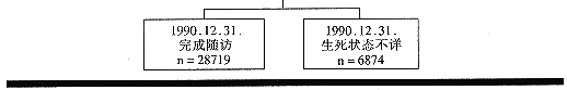 应用计算机表格、缩微照片、缩微影盒及手写资料,于1984年建立了包括最初35 630例患者的主资料库(附图)。国立癌症研究所(NCH)与4个地区研究中心(波士顿哈佛大学、纽约Sloan-Kettering癌症中心、洛山矶南加州大学以及北卡罗来纳Triangle研究学院及研究中心)合作,进行了第二次死亡率随访列队研究。有4 010例未包括在内,其中1 414例来自其他地区的3个小治疗中心;另2 596例在完成第一次研究后已从经治医院记录中删除。将这些病例从进一步随访中删除是因为技术原因和无法与病例特点相联。删除这些病例后,31 620例患者符合进一步随访标准。由于在第一次随访时已有6 228例患者死亡,故只能对其余25 392例继续随访。在摘取补充鉴定资料后,使用国家死亡索引、卫生保健资金筹集署、社会安全局、国立人寿统计室、国立机动车管理局、当地追访系统以及商业追访公司的资料记录进行追访。死亡病例均获得死亡证明复印件,并根据国际疾病分类第8版(ICD-8)进行编码18。第一次随访研究的死亡原因,由经过训练的疾病分类学家,根据ICD-719和ICD-8重新编码。最终有35593例患者被编入本列队研究。