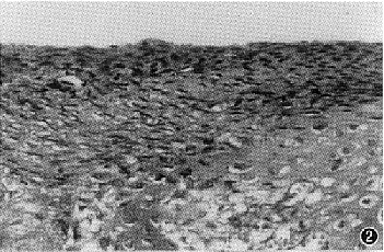 本实验在髁突软骨全层损伤后植入接种于胶原膜内的异体软骨细胞,术后观察20周发现,髁突的大体形态基本正常(18/20),光镜下见修复组织与周围正常组织完全融合、无裂隙。修复组织内的细胞为分化良好的软骨细胞,随时间延长对甲苯胺蓝异染性逐渐增强,说明移植的软骨细胞能够合成软骨特异性基质——蛋白多糖。此外,术后8周时修复组织的透射电镜观察表明,移植的软骨细胞形态及超微结构与正常对照组基本相同。