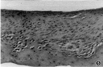 (2)细胞移植组:术后1周时2侧髁突软骨损伤区充满修复组织,与毗邻的正常关节软骨融合,无裂隙,表面光滑。修复组织形成与正常关节软骨相连续的纤维组织层及增殖层,增殖层下方的细胞密集但排列无明显的规律(图1)。高倍镜下,修复组织内的细胞呈圆形、位于软骨陷窝内,为分化良好的软骨细胞。损伤区无软骨下骨皮质。甲苯胺蓝染色无异染性(2/3)。术后1周时的另一侧髁突软骨损伤区凹陷,充满疏松纤维结缔组织,血管丰富。高倍镜下大部分细胞为圆形的未分化间充质细胞,未见软骨组织。甲苯胺蓝染色无异染性(1/3)。术后2周时所有实验侧髁突软骨损伤区修复组织表面与毗邻正常关节软骨平齐,纤维组织层及增殖层与正常者连续。修复组织内细胞密集,高倍镜下为分化良好的软骨细胞。软骨下骨皮质缺如。甲苯胺蓝染色呈弱异染性(3/3)。术后4周时实验侧髁突软骨损伤区修复组织表面与毗邻正常关节软骨平齐,二者间无裂隙。已形成与正常者相连续的软骨下骨皮质。修复组织内为分化良好的软骨细胞,排列杂乱(图2),甲苯胺蓝染色弱(3/3)。术后8周时所有实验侧髁突软骨损伤区修复组织与毗邻正常软骨及软骨下骨皮质间互相融合。修复组织内肥大软骨细胞层可见部分区域与透明软骨类似,软骨细胞有呈柱状排列的趋势(图3)。甲苯胺蓝染色部分区域呈紫红色,大部分区域染色弱(3/3)。术后12周时2侧髁突软骨损伤区表面光滑,纤维组织层及增殖层与正常者连续,增殖层下方可见分化良好的软骨细胞(图4),甲苯胺蓝染色弱(2/3)。术后12周时另1侧髁突软骨损伤区的结构与伴有软骨下骨皮质穿通的髁突软骨损伤组相似,损伤区表面为纤维组织、深部为致密骨质,未见软骨细胞(1/3)。术后20周时的所有实验侧髁突软骨损伤区凹陷,稍低于周围正常关节软骨,修复组织与周围正常关节软骨及其下方皮质骨间互相融合,无裂隙。纤维组织层及增殖层与正常者连续,增殖层较厚,肥大软骨细胞层之细胞层数明显减少(图5)。甲苯胺蓝染色呈淡紫红色,比正常者弱(3/3)。光镜观察的全部髁突软骨损伤区修复组织周围均未见淋巴细胞浸润(18/18)。