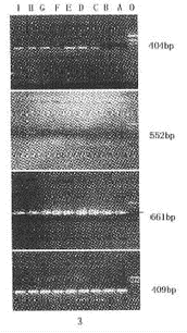 GDNF引物参照文献[2],两条引物序列分别为:上游引物为5'TCACCACATAAACAAGCGGCG-GCACT3',下游引物为5'GTCAGATACATCCAC-ACCGTTTAG3',扩增长度为404 bp的cDNA片段,GDNFR-α的引物[3]为:上游引物为 5'GACTCCCAACTACGTAGACTC3',下游为5'GAGTCTACGTAGTTGGGAGTC3',扩增长度为552 bp cDNA 片段。GDNFR-β的引物[9]为:上游引物为5'GTGCAATTGTCGTGGCAGT3',下游引物为5'ACTGCCACGACAATT-GCAC3',扩增长度为661 bp cDNA 片段。经检验引物与基因库之间无特异性同源区域。内参照的β-actin 两条引物序列分别为:上游引物为5'TCATGAAGTGTGACGTTGACATCC-GTAAAG3',下游引物为5'CCTAGAAGCATTT-GCGGTGCACGATGGAGG3',扩增长度为409 bp。所有引物由上海生工生物工程公司合成。