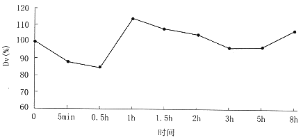 注:猫数为6只; HR、RR的单位均为次/min,MABP单位为mm Hg 2. 软脑膜血管管径及微区脑血流量的变化(表2):Da的变化见图1。CMW后5,30 min Da较伤前明显缩小,分别为伤前的82.9%~84.1%、79.2%~89.2%。Da在1 h时扩张,达伤前的110.8%,2~3 h恢复至伤前正常水平,5~8 h管径较伤前明显缩小(P<0.05)。软脑膜细静脉管径的变化见图2。致伤后5,30 min后1~2 h呈明显扩张状态,为伤前的(108.5±5.9)%(P<0.05),3~5 h恢复正常,8 h扩张至伤前的(108.1±5.5)%。微区脑血流量(CBF)的变化见图3。致伤后微区脑血流量于5 min、30 min明显下降(P<0.05),分别降至伤前的76.3%~78.4%和68.8%~70.1%,继之出现过度灌注,于1 h达伤前的118.5%,3 h恢复正常。5~8 h CBF明显减少,最低降至伤前的78.1%(P<0.05)。