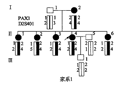 1.4.1 PCR扩增2号染色体的微卫星标志PAX3、D2S401 PAX3引物序列[5]:5′-CCC AGA TGC CTT CTT A-3′,5′-CAG GGA GAT GGC AGT T-3′。PCR反应体系:25μl反应体系含基因组DNA 200ng,dNTP 200 μmol/L,引物各10pmol,MgCl2 0.75 mmol/L,Taq DNA聚合酶1单位。PCR反应条件:94℃预变性5min;94℃ 1min,49℃ 1min,72℃ 1min,循环30次;72℃ 延伸10min。D2S401引物序列[6]:5′-CAG AAG TTG CAG AAC CAT-3′,5′-GGG AGA TTT GGA GAA ACA-3′。PCR反应条件:MgCl2 1.0 mmol/L,退火温度50℃,余同PAX3。