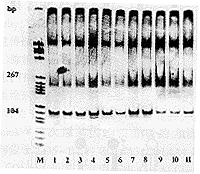 9例TBMN患者和2例正常对照均无Alul酶切位点。M=PBR322/HaeⅢ,条带1~9为9例TBMN患者,条带10~11为2例正常对照