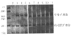 2.3 结果观察:取PCR产物6μl与1μl上样缓冲液混合,于80g/L的聚丙烯酰胺凝胶中电泳,电泳缓冲液为0.5×TBE,恒压100V,电泳1.5h后揭胶。将凝胶置体积分数为10%的乙醇固定5 min,10g/L硝酸离子化3 min,0.02 mol/L硝酸银于摇床上染色20 min,0.28 mol/L碳酸钠加体积分数为0.019%的甲醛显色至带型清楚, 体积分数为10%的醋酸再固定2 min,每步之间均用蒸馏水冲洗,最后干胶保存。