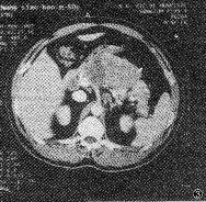 , http://www.100md.com 图3 胰体乳头状腺癌并腹膜后淋巴结转移。CT增强扫描示胰体部 轮廓明显增大,呈等、低混杂密度,腹腔动脉干左侧可见肿大的淋巴结