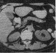 2.1.2 胰腺外异常CT表现:见表2。①胰周脂肪层模糊:30例。② 胰周大血管模糊:3 0例,肠 系膜上动脉癌栓形成2例。③ 肝内、外胆管扩张,胆囊增大:本组中胰头肿大伴肝内胆管扩 张30例,肝外胆管扩张32例,胆囊增大32例,胆总管扩张,绝大多数呈突然性狭窄截断。④ 转移性病变:胰周与大血管旁淋巴结肿大10例(图3),肝转移5例,腹水2例。