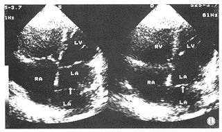 讨论三房心是少见的先天性心脏病,多合并房间隔缺损,而房间隔完整的三房心罕见。合并房间隔缺损的三房心临床上表现酷似房间隔缺损,有时可合并紫绀。而房间隔完整的三房心临床表现酷似二尖瓣狭窄,均无紫绀。就其诊断而言,现有的心脏科检查设备中彩色多普勒超声心动图对本病有特异性诊断价值。其中的二维超声心动图可清楚显示左心房内的隔膜状回声和隔膜中间的孔径大小,彩色多普勒血流显像显示过隔膜中间孔的五彩镶嵌射流束血流信号,因无房间隔缺损即没有分流束血流信号。