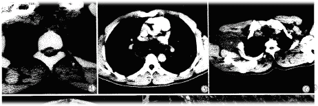 纵隔内神经鞘瘤,除1例位于椎体前方外,其余均位于脊柱两旁,边缘光滑,宽基底与脊柱相连,密度一般均匀(图4),2例呈低密度(类似水样密度)CT值13-19Hu,其余8例密度均匀低于或等于肌肉密度,增强扫描1例无强化(图5),4例不均匀强化。胸椎及肋骨骨质未见明确破坏和吸收,肿瘤未侵入椎管内。