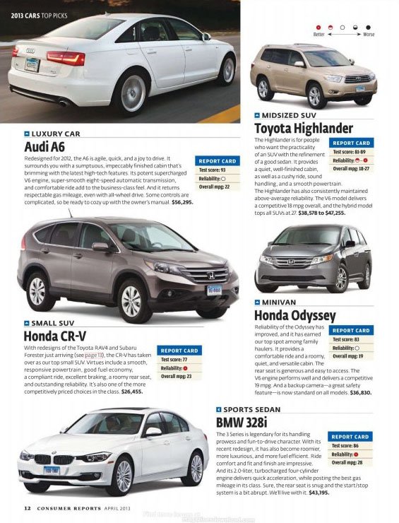 《消费者报告的最佳和最差汽车2013年4月》,本期是对最好和最差的汽车进行详细的介绍。其中包括汽车的外观、性能、内设、耗油量及舒适性等等。爱车人士或买车人士不可不看的期刊内容。