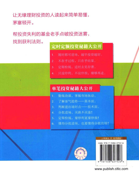 每个人都听过要投资基金,都知道要定时定额投资,但是真正了解基金的人却是寥寥无几。不知何时进场?该挑选哪一只基金?何时是卖出基金的时机?《买基金为自己加薪》所讲述的是定时定额投资基金的方法,作者指出只设停利,不设停损,赚够就走。看收益,更要看风险。而且,作者在书中多次强调,投资基金要以定时定额投资为主,以单笔投资为辅,实际上,定时定额投资就等于为自己存钱。