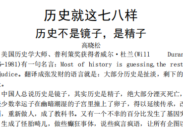 中国人总说历史是镜子,其实历史是精子,绝大部分湮灭死亡,只有极少数幸运子在幽暗潮湿的子宫里撞上了卵子,得以延续传承,改头换面,重新做人,成了教科书。又有一个不幸的百分比发生了基因突变,生成了怪胎畸儿,做些癫狂事体,说些疯言疯语,让所有企图以科学方式研究历史的老头老太太随时有被打脸的忧虑,又或者常常梦见自己的学术走光露点,斯文扫地而惊醒,感到万分沮丧,甚至开始怀疑人生。