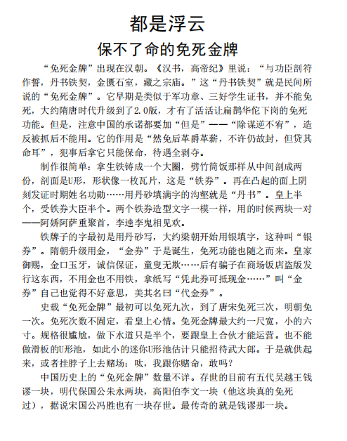 铁牌子的字最初是用丹砂写,大约梁朝开始用银填字,这种叫“银券”。隋朝升级用金,“金券”于是诞生,免死功能也随之而来。皇家御赐,金口玉牙,诚信保证,童叟无欺……后有骗子在商场饭店盗版发行这东西,不用金也不用铁,拿纸写“凭此券可抵现金……”叫“金券”自己也觉得不好意思,美其名曰“代金券”。