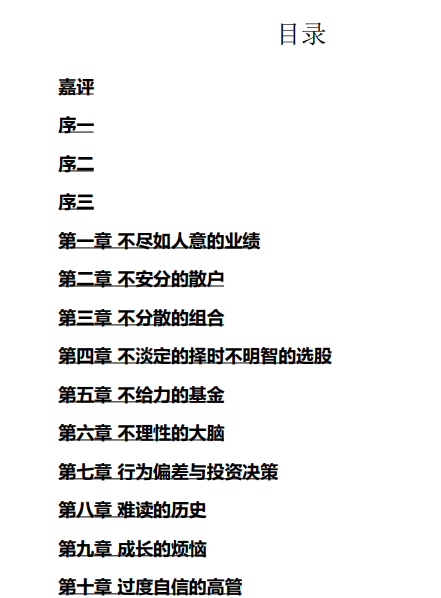 差,用行为金融学的分析方法让我们感受到市场情绪对投资者的误导,用实际的数据显示了令人大跌眼镜的结果,最后将我们引入不得不服的
