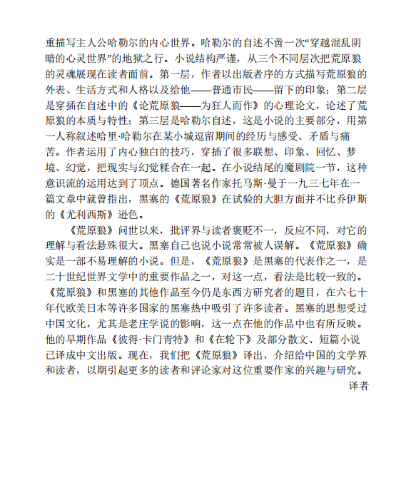 在一九四一年《荒原狼》瑞士版后记中,黑塞写道:“荒原狼的故