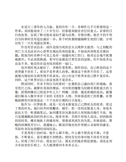 他作为一位梦游者,或是一位尚未察觉自己已然死去的死者,度过了那段时光。旭日初升时便醒来,刷牙,把一旁的衣服套上身,坐电车赶往大学,听课做笔记。如同遭受狂风袭击的人死死抱住路灯不放,他只是遵循眼前的时间表行动。除非有事,否则不和别人说话。回到独居的房间里,瘫在地板上倚墙呆坐,想着或死或生的失落。在他面前,黑暗的深渊张开巨口,直通地心。眼前浮现出化作坚硬云朵旋转的虚无,耳际传来压迫鼓膜的深深沉寂。