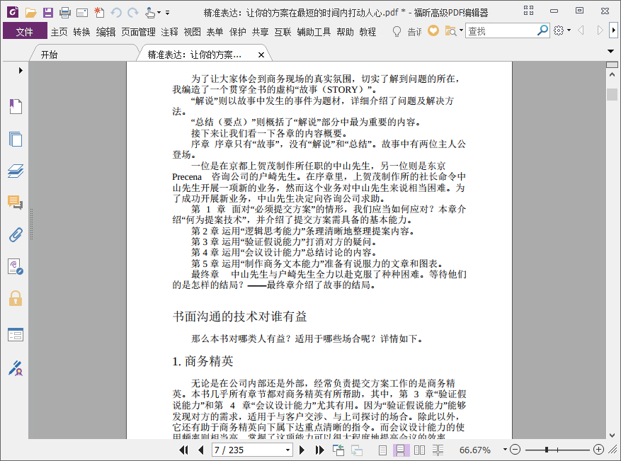 这本书以一个贯穿全书的虚构故事做引,不仅真实再现了商务活动的氛围,各章中的解说部分也指出了故事中的问题所在,并在此基础上十分详尽地解说了解决问题的方法和技巧。