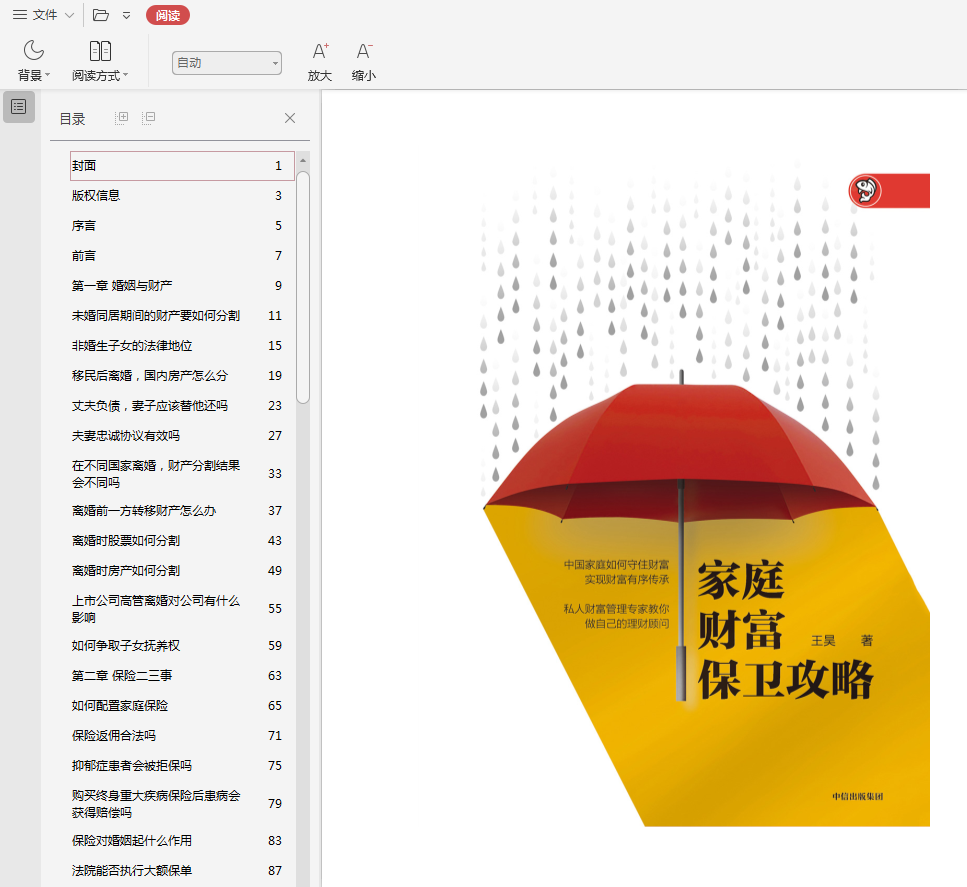 《家庭财富保卫攻略》涉及家庭财富管理的五大核心类别:婚姻与财产、保险、移民与税务、家族信托与财富传承、继承。书中围绕48个家庭财富管理典型案例,从法律视角进行分析与点评,为有相关需求的高净值人群提供借鉴,为中产阶级的财富焦虑问题提供应对策略。
