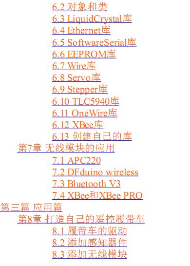Arduino是一个注重实际动手操作的产品,所以本书以实际应用为纽带将各个章节联系起来,首先介绍Arduino的一些基础知识,接着针对具体应用介绍了一些扩展板以及Arduino扩展库,最后应用之前的内容完成了具有视频监控功能的履带车、遥控机械臂以及双足机器人的制作。