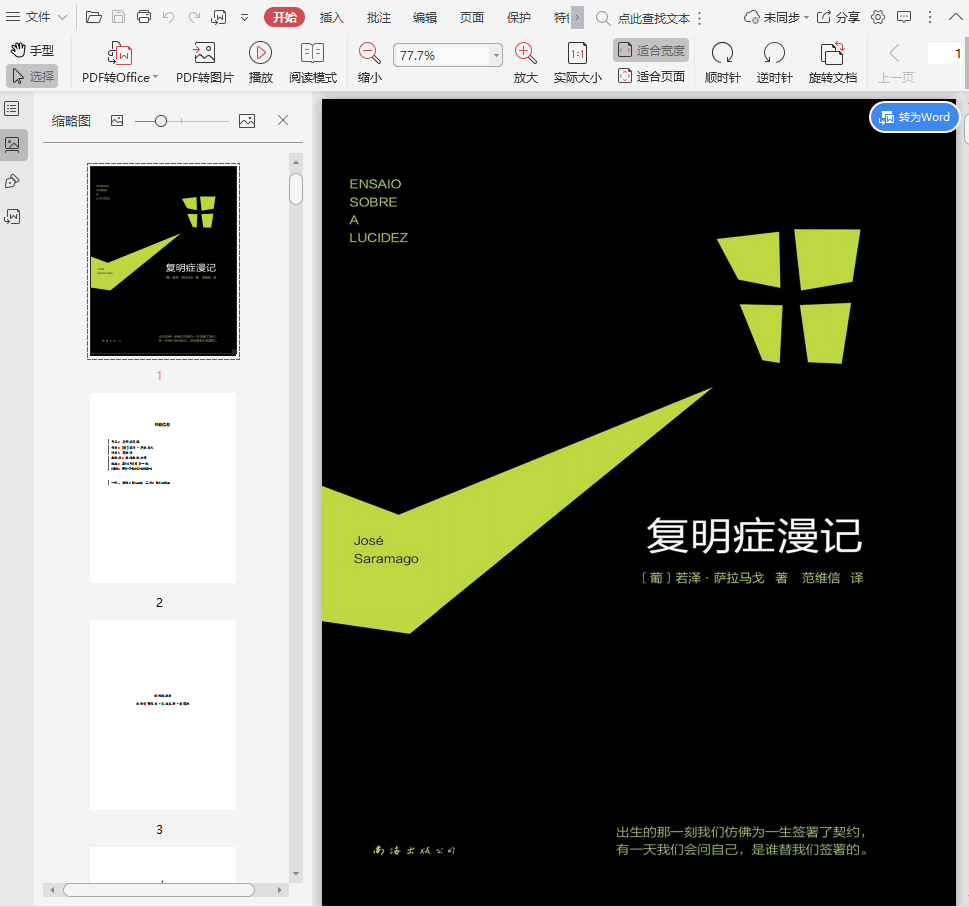 萨拉马戈在写完《失明症漫记》十年后,续写了那座曾经陷入地狱的城市的故事。《复明症漫记》以充满黑色幽默的荒诞剧开场,以曲折而暖心的硬汉小说收尾,讲述了一个看似不可能却又十分日常的场景下的故事。萨拉马戈用寓言为我们呈现出未来,同时以一种令人不安的方式让我们看清了现实。困顿于当代生活丛林的我们每一个人,都应该是《复明症漫记》的读者。