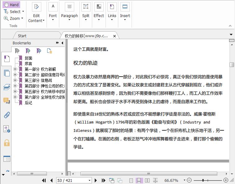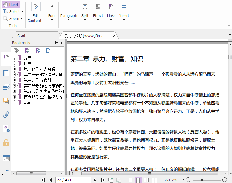 本书所说的权力按作者的定义,是对别人有特殊企图的控制,而财富、暴力和知识构成了权力框架的三角基石。而从这三种权力形式出发,托夫勒探讨了以下内容:权力本质的改变,改造了企业界的社会关系;从资本的转换到“知识密集业”与“低知识产业”的冲突,从超市的电子化到家族企业的兴起乃至全新组织形态的出现,我们会从中理出权力新的架构;产业与经济的深层改变也带动政治、媒体和全球间谍战的巨大改变;今日庞大、扭曲的权力斗争对贫穷国家、社会主义国家和未来的美国、日本和欧洲会产生怎样的影响。