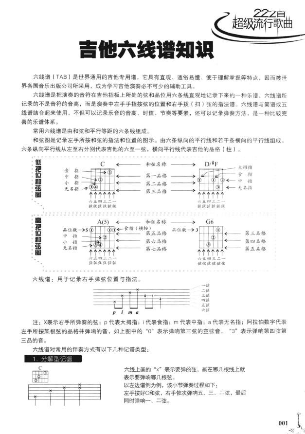 六线谱是把演奏的音符在吉他指板上所处的弦和品位用六条线直观地记录下来的一种乐谱,六线谱所记录的不是音符的音高,而是演奏中左手手指按弦的位置和右手拨(扫)弦的指法谱。六线谱与简谱或五线谱结合起来使用,不但可以记录乐音的音高、时值、节奏等要素,还可以记录弹奏方法,是一种比较完善的乐谱体系。