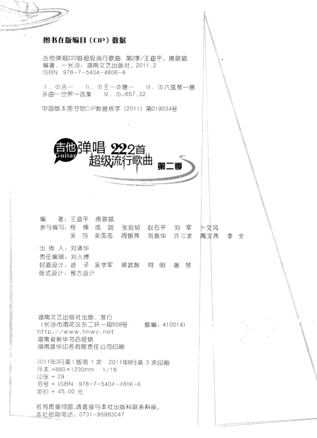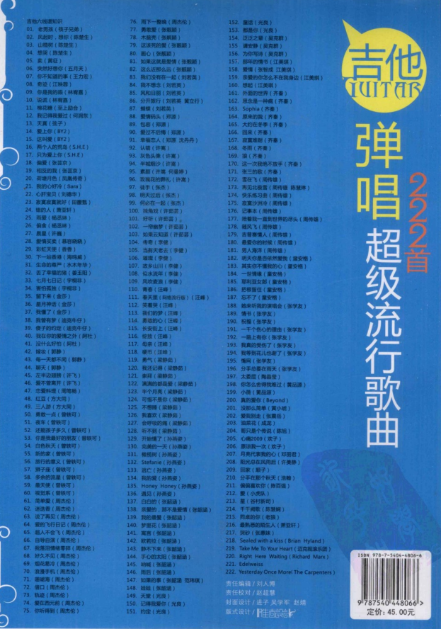 很经典的一本学吉他弹唱的图片,吉他弹唱222首流行歌曲共有好几季,这里为大家附上的是吉他弹唱222首流行歌曲(第二季)由湖南文艺出版社出版,包含了222首歌曲,还有很详细的吉他谱,想要学吉他的朋友一定要收藏。