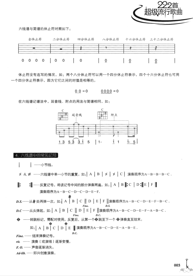 注:X表示右手所弹奏的弦;p代表大拇指;i代表食指;m代表中指;a代表无名指;阿拉伯数字代表左手所按某根弦的品格并弹响的音,如上图中的“0"表示弹响第三弦的空弦音,"3"表示弹响第四弦第三品的音。