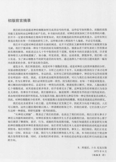本书初版在1976年问世时,序言中曾这样写道,本书的目的是“描述神经细胞如何完成其信号的传递,这些信号如何整合,而脑的高级功能又是如何由这种整合产生的。本书所面向的读者对神经系统如何工作有浓厚的兴趣,但并非一定要有特殊的生物科学背景知识。我们用精选的实例来说明其要点
