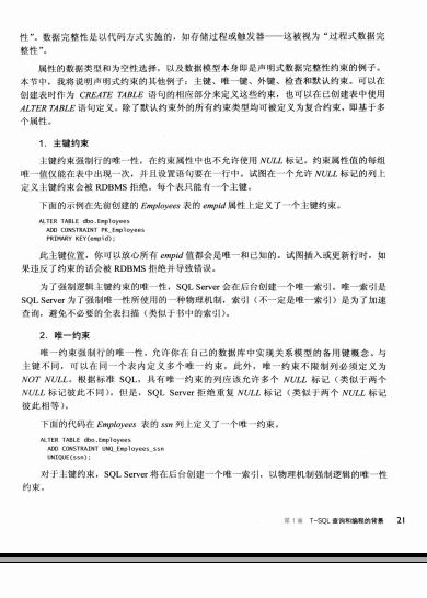 第1章,"T-SQL查询和编程的背景”提供了SQL的理论背景、集合理论和谓词逻辑,探究了关系模型和更多内容,介绍了SQL Server的体系结构,并解释如何创建表和定义数据完整性。