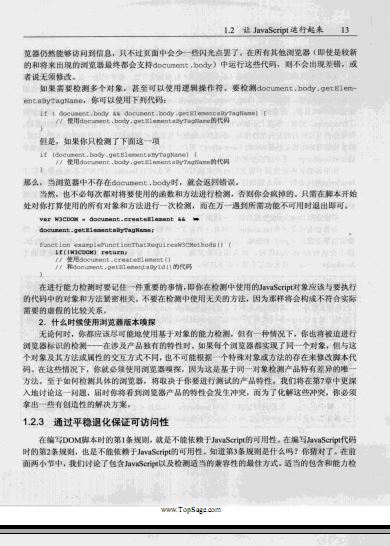 DOM(Document Object Model,文档对象模型)脚本编程经常会被误解为Web上的某种脚本编程,实际上,纯粹的DOM脚本编程只包括w3C DOM规范中所涵盖的特性和方法。也就是说,不包括任何专有的浏览器特性。在理想的世界里,我们可以遵循标准,忽略专有特性,最终完成可以在任何设备中运行的脚本。但这个世界不是理想的世界-目前还不是。众所周知,并非所有设备或浏览器都合乎w3C标准,那像我们这样的程序设计人员要满足每个人的要求该怎么办呢,怎样才能继续严格遵守w3C DOM规范呢?