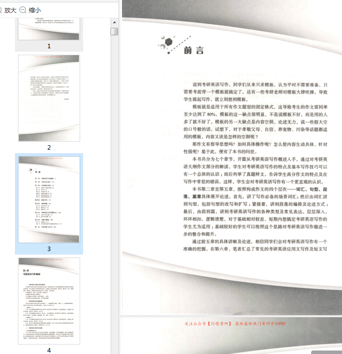 最后,由段到篇,讲到考研英语写作的各种类型及常见表达。层层深入环环相扣,逻辑清楚,对于基础相对较差、短期内想搞定考研英语写作的学生尤为适用;基础较好的学生可以按照这个思路对考研英语写作做进一步的整合和提升。